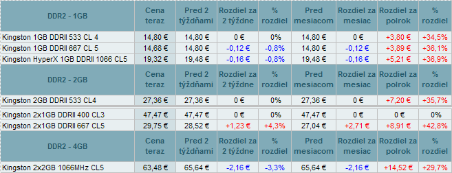 Pamäte za uplynulé 2 týždne väčšinou zlacňovali. U DDR modulov bol pokles cien do 1,7%. DDR2 menili ceny od +4,3% do -3,3%. U DDR3 nastalo jedno výrazné zdraženie až o 51,1%. Ostatné moduly zlacneli do 11,4%.