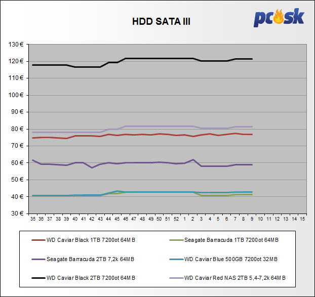 Najlepšie ceny za 1GB diskovej kapacity sú nasledovné: SATAIII na 3000GB a 4000GB, SSD na 480GB.
