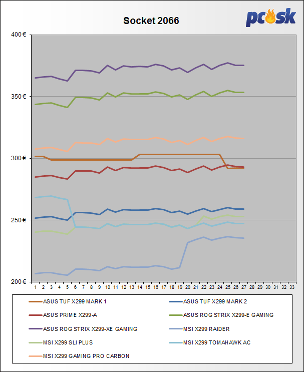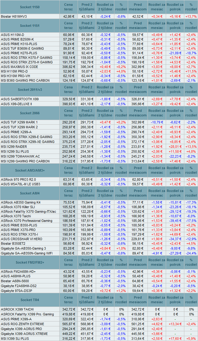Základné dosky menili ceny od +4,0% do -2,0%. Z prehľadu vypadli dosky ASUS ROG RAMPAGE VI APEX, ASUS ROG RAMPAGE VI EXTREME (2066) a ASUS PRIME B350-A (AM4).