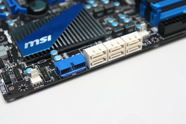 Šestica S-ATA III 6Gbps portov samozrejme patrí južnému mostíku AMD 950, očakávať môžeme tradičnú plejádu RAID režimov 0, 1, 0+1 a 5. Modrý konektor naľavo od bielych S-ATA patrí USB 3.0 radiču – vďaka nemu môžete mať nové rozhranie aj na prednom paneli skrinky.
