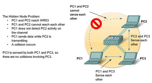 V takomto prípade sa využije RTS(Request to send)/CTS(Clear to send) technika, ako doplnenie CSMA/CA metódy. RTS je rámec, v ktorom stanica informuje príjemcu, že mu chce poslať dáta a informuje ho o odhadovanej dĺžke trvania prenosu. CTS je rámec, v ktorom príjemca (AP) potvrdzuje prijatie RTS rámca a informuje stanice o potrebnom čase na prenos avizovaný v RTS.