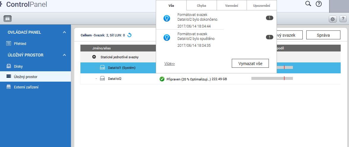 Operačným systémom je QTS 4.3.3 (v čase testu). Celé prostredie je taktiež lokalizované do češtiny. Musím povedať, že prostredie je používateľsky prívetivé. Už na prvý pohľad je vidno, že QNAP mieri skôr do podnikovej sféry a pripadá mi technicky vyspelejšie. Na rozdiel od Synology sa viac podobá na desktop, aj keď častokrát musíte otvoriť staré-známe hamburger menu pre ostatné aplikácie. Výrobcu chválim za prehľadné nastavenie. Synology so svojim systémom je v tomto smere značne pozadu, nastavenie v Synology je skrátka horor (predovšetkým správa práv). Ako som už naznačil, QNAP nejde rovnakou cestou a všetko je pekne prehľadne usporiadané do 4 hlavných sekcií a niekoľkých desiatok pod sekcií.