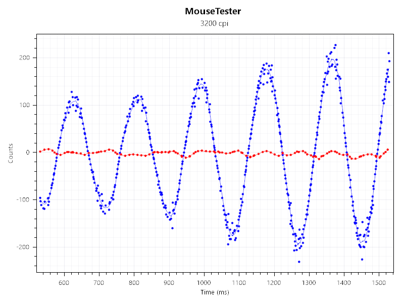 Counts vs Time - počet "správ" ktoré myš odošle do počítača za časovú jednotku. Pri tomto grafe je dôležitá rovnomerná distribúcia bodiek/reportov okolo čiary, ktorá označuje pohyblivý priemer. Vtedy, laicky povedané, myška nestráca stopu. Akékoľvek body očividne mimo plynulú trajektóriu, prípadne úplné vynechávanie môžu naznačovať problémy senzora (angle snapping, predikciu).