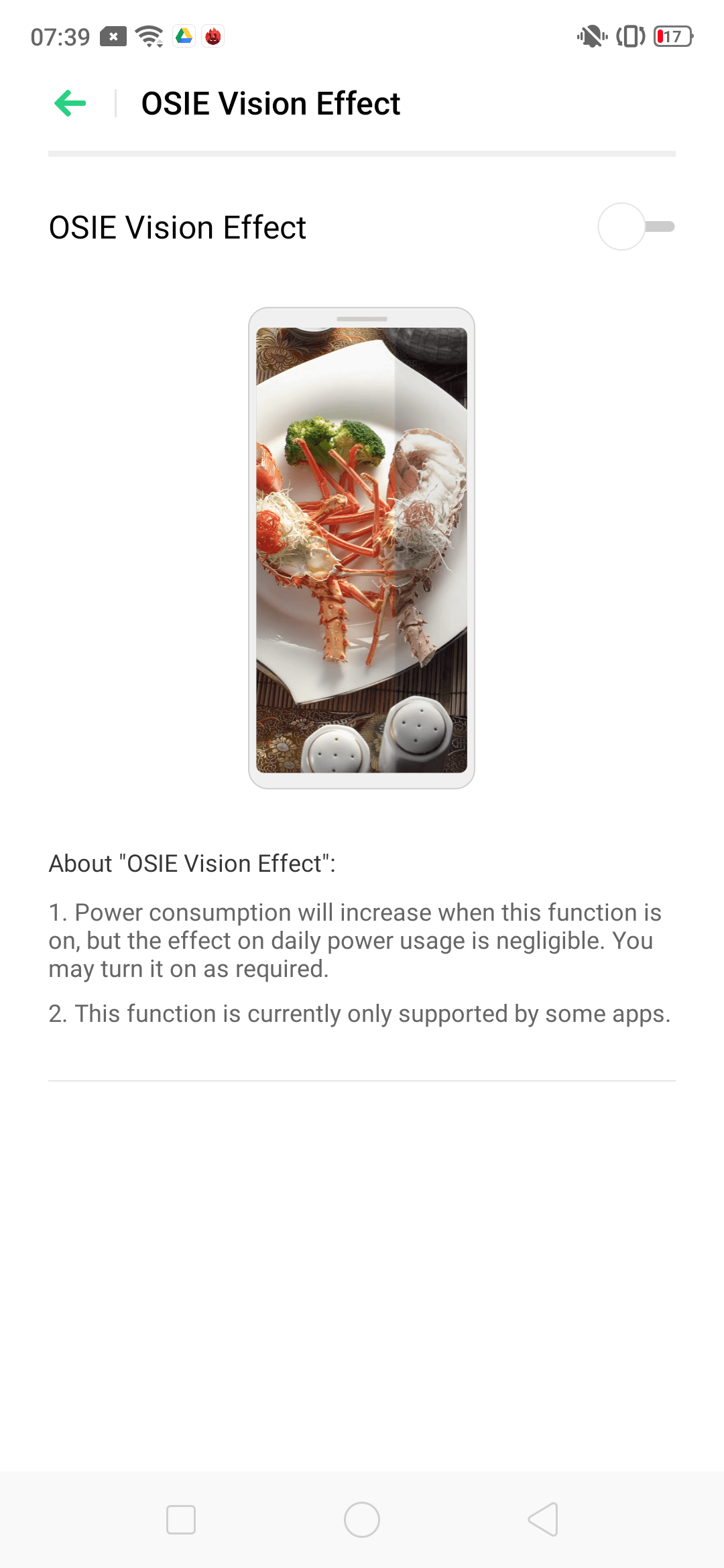- OSIE efekt (Object & Semantic Images & Eye-tracking). V niektorých aplikáciách by ste mali vidieť vylepšené farby objektov. V súčasnom OS sa mi však nepodarilo prísť na to, v ktorých aplikáciách to funguje. Na výber máte iba zapnúť a vypnúť. V iných smartfónoch Realme je podľa všetkého dostupný zoznam aplikácií v ktorých to práve funguje.