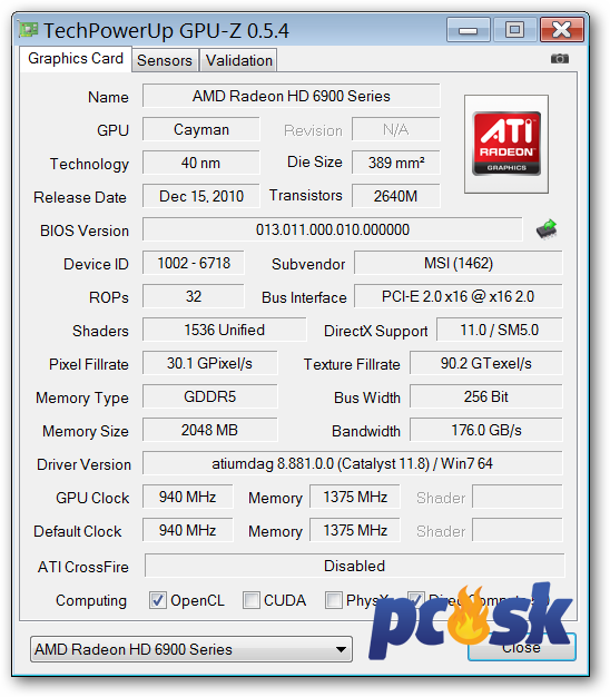 Pracovné frekvencie grafickej karty MSI Radeon HD 6970 Lighting sú 940/1375MHz.