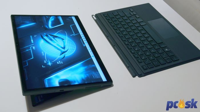Podsvietenie klávesnice je RGB s možnosťou výberu efektu cez aplikáciu Armoury Crate. Samotná klávesnica je pasívna a funguje iba počas spojenia s tabletom. Aj pri malej hrúbke sa nejedná o nejakú „gumenú náhradu“, ale o klávesnicu typu chicklet s 1,7mm zdvihom klávesov, na ktorej sa dá plnohodnotne písať. Výrobca nevynechal ani touchpad.