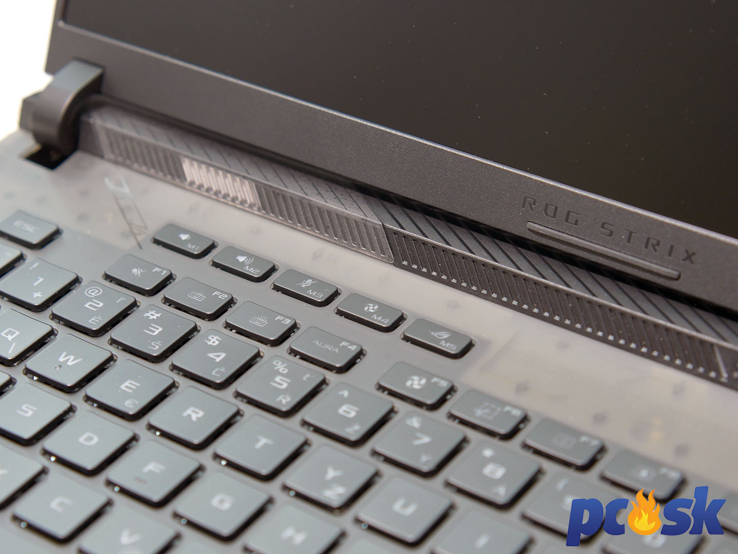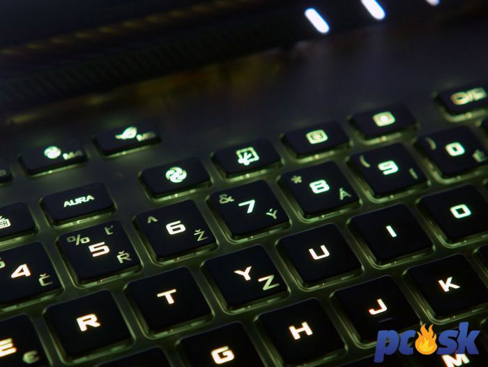 Výrazným dizajnovým prvkom, na ktorý nesmiem zabudnúť je podsvietenie. To sa okrem klávesnice a loga nachádza v prednej časti, kde siaha cez rohy až na boky notebooku, a v zadnej časti nad výduchom horúceho vzduchu. Podsvietenie je možné ovládať a konfigurovať cez aplikáciu Aura Sync a tiež pomocou skratiek na klávesnici, kde je možné cyklovať rôzne efekty a statické podsvietenie. Samozrejmosťou je aj možnosť podsvietenie úplne vypnúť.