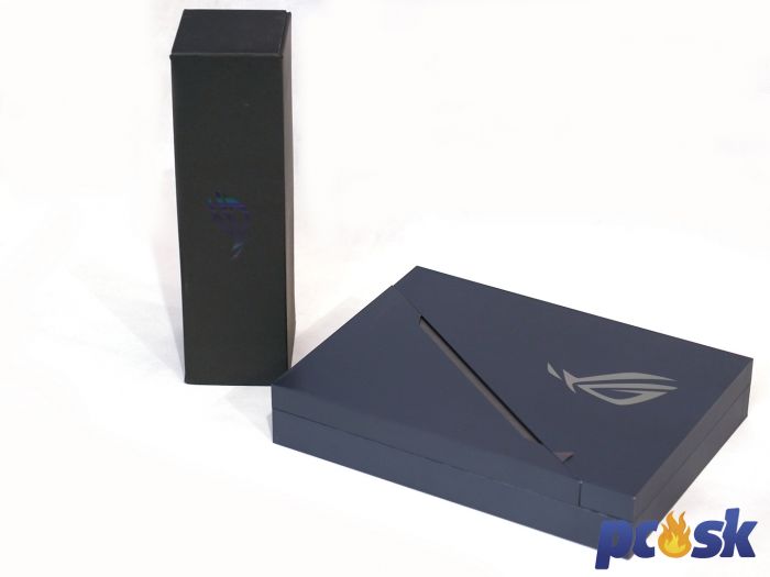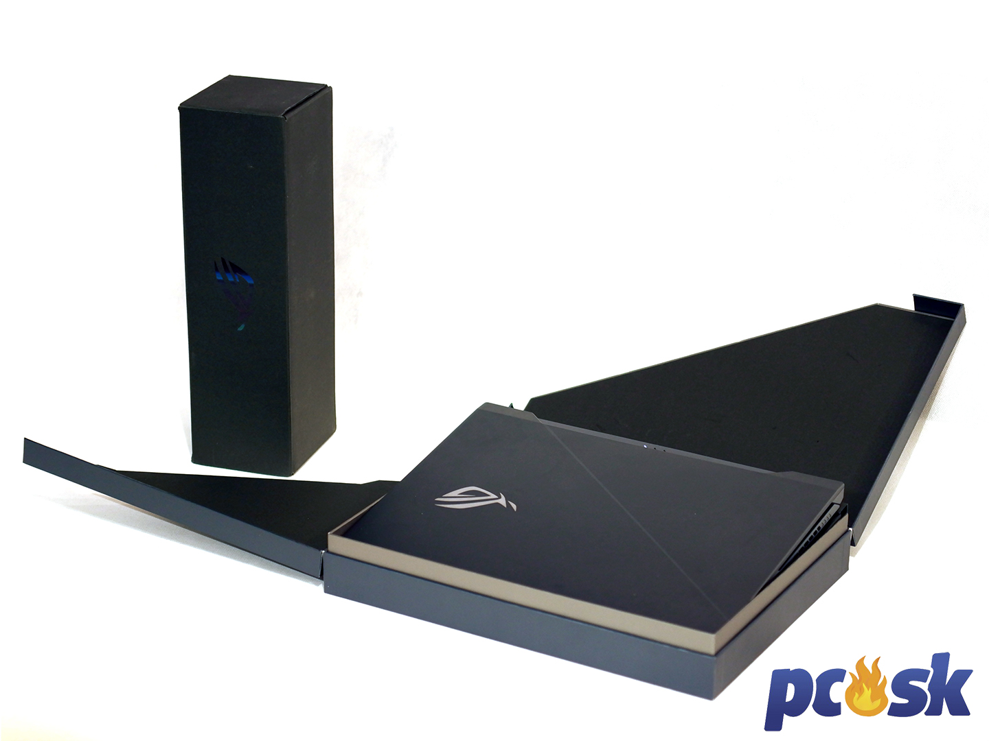 ROG už tradične používa prepracovaný vnútorný systém, ktorý pri otvorení veka podvihne notebook vo vnútri. V tomto prípade je veko krabice netradične rozdelené diagonálne na dve časti.