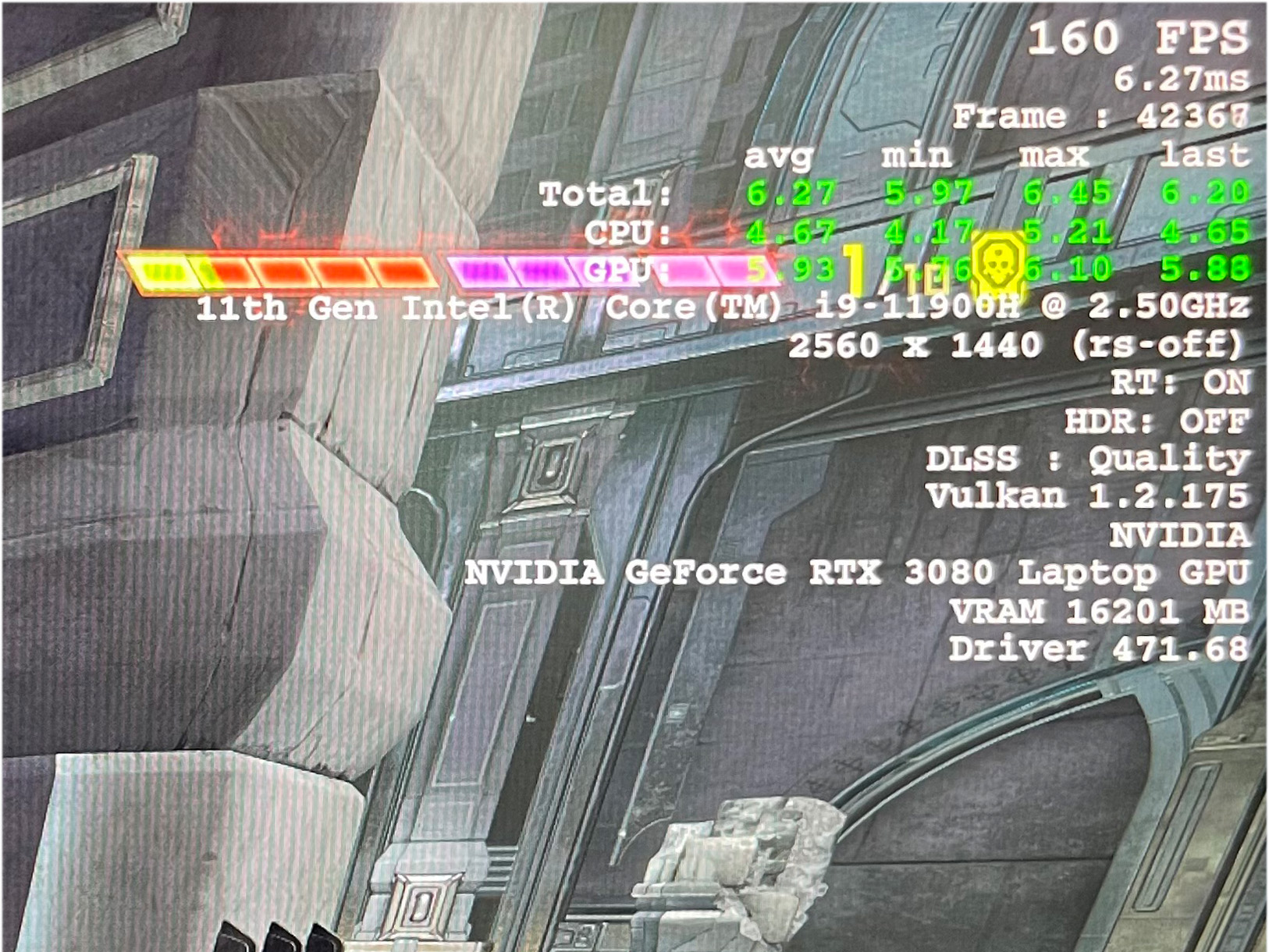 Herný výkon má na starosti grafická karta RTX 3080, teda v súčasnosti to naj čo je k dispozícii. Notebooková verzia má oproti desktopovej verzii obmedzenú maximálnu spotrebu na 140W, čomu zodpovedá aj nižší počet procesorov aj nižšie maximálne takty.
