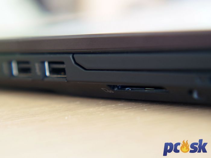 Pravá strana notebooku obsahuje otvory na chladenie, bohužiaľ v tomto prípade, výduchy teplého vzduchu. Nachádzajú sa tu aj dva USB Typ-A porty v generácii 3.2 a čítačka SD kariet.