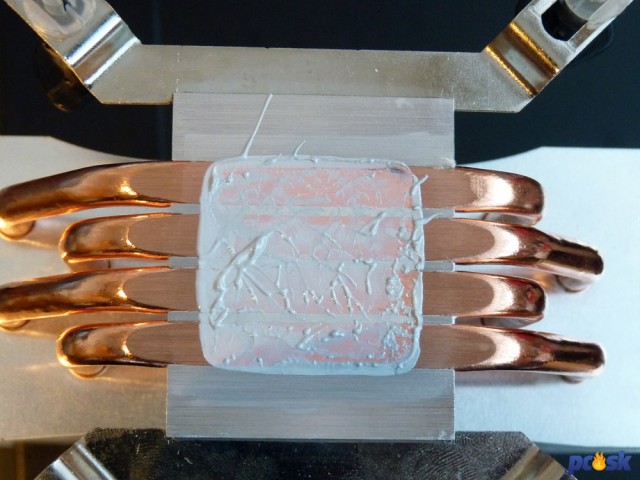 Vráťme sa však k montáži. SilentiumPC Fera používa nechválne známe push-piny, ktoré nájdeme aj na BOX chladičoch od Intel-u (pre AMD je tu spona). Na tom by nebolo nič zlé, aj tieto kolíky dokážu spraviť fajn prítlak, dokonca do takej miery že ohnú celú dosku, no na tomto chladiči bol použitý nejaký iný typ. Po osadení na procesor nesedel chladič úplne pevne a kolíky mierne „pobehovali“ na svojej pozícii, aj keď boli správne zacvaknuté. Výsledok? Nie príliš dokonalý kontakt. Vidieť je to možné aj na nasledujúcej fotografii, kde je v jednom rohu aj suché miesto: