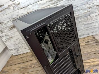 Celý predný panel je perforovaný vďaka čomu majú predné ventilátory dostatok plochy na nasávanie vzduchu. Za predný panel viete dať 3x120mm alebo 2x140mm ventilátory. Horná časť je chránená prachovým filtrom, ktorý tu drží cez magnetické pásiky (rovnako ako naposledy testovaná skrinka DeepCool CK 500W).