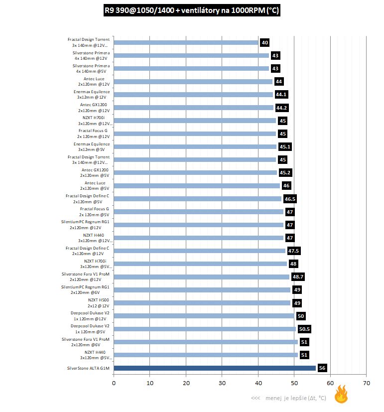 SilverStone ALTA G1M od výroby nevyniká až tak skvelým chladením ako by sa dalo očakávať, ale stačí pridať jeden alebo dva ventilátory a situácia je hneď iná. Keď som sa hral s chladením, popravde som si nebol istý, či by bola táto skrinka tou, ktorú by som si sám kúpil a dlhodobo nechal. Vo finále som si skrinku veľmi obľúbil aj vďaka tomu, že je pomerne malá (málokde vám bude zavadzať a hodí sa na stôl alebo pod stôl, kde nemáte až tak veľa miesta), dostanete sem micro-ATX dosky, ktoré toho ponúkajú viac ako mini-ITX dosky, dobre vyzerá a nakoniec je aj chladenie akceptovateľné.