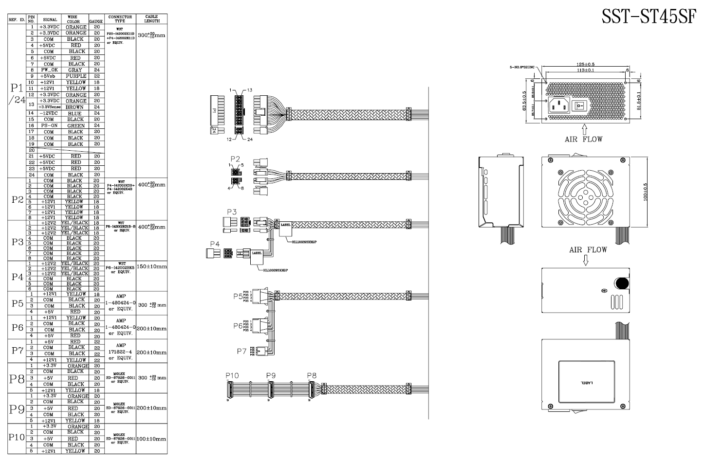 ST45SF prichádza s povinnou výbavou v podobe napájacieho kábla a inštalačných manuálov, bonus reprezentuje konverzný rámček na štandardný ATX rozmer a štyri sťahovacie pásky.