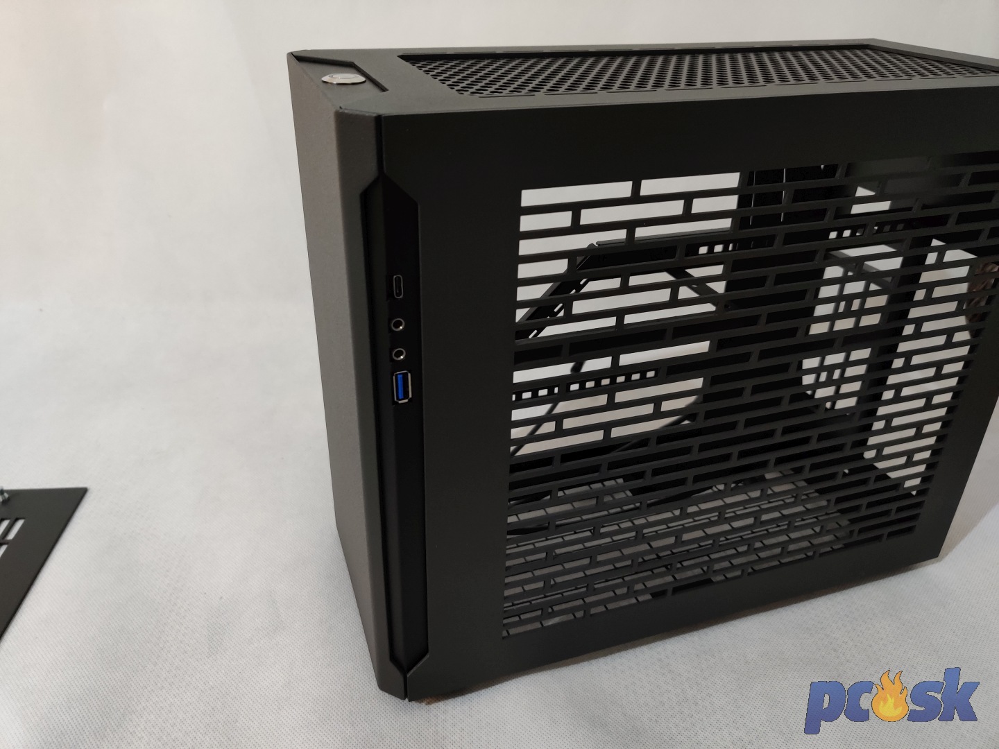 Classic case is relatively easy to describe... but to describe Sliger SM580 can be kind of hard, or more precisely, there isn´t a lot to describe 😊 As I have written before,  we are talking about minimalistic but maximally functional case and its adapted inner construction. A big advantage of this case is the fact that the graphic card is put through PCIe Raiser on the opposite side of the board. That brings two big advantages – GPU cooling is independent and won ´t suck the warm air from CPU cooler, and the second advantage is that you can use the whole length of the case for the GPU. No component or case cables will take up its space. Without additional holder for HDD you can install two SSD discs into the case, which are hidden behind the front panel.