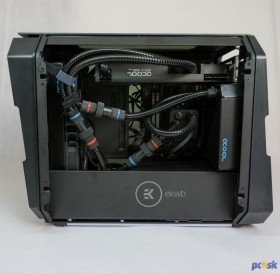 Tým, že som použil mini ITX skrinku som sa trochu obmedzil v priestore pre radiátor chladiča Eisbear. Ten príde s radiátorom s hrúbkou 45mm a medzi ním a blokom už nezostal priestor pre žiaden ventilátor.