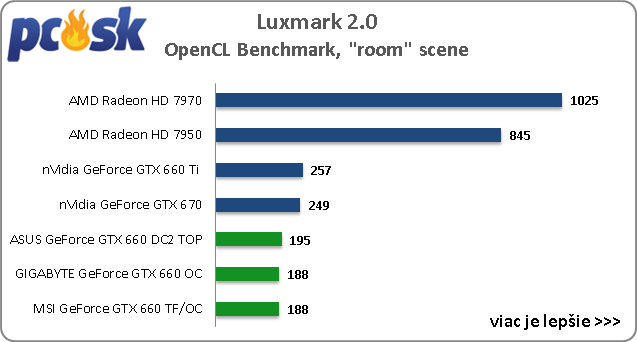 Luxmarkje voľne dostupný OpenCL renderovací benchmark pre viaceré platformy (Windows, Linux, MacOS, atď). Ako testovaciu scénu pre renderovanie sme použili “Room Scene“, ktorá je z trojice testov najkomplexnejšia a pozostáva až z dvoch miliónov trojuholníkov.