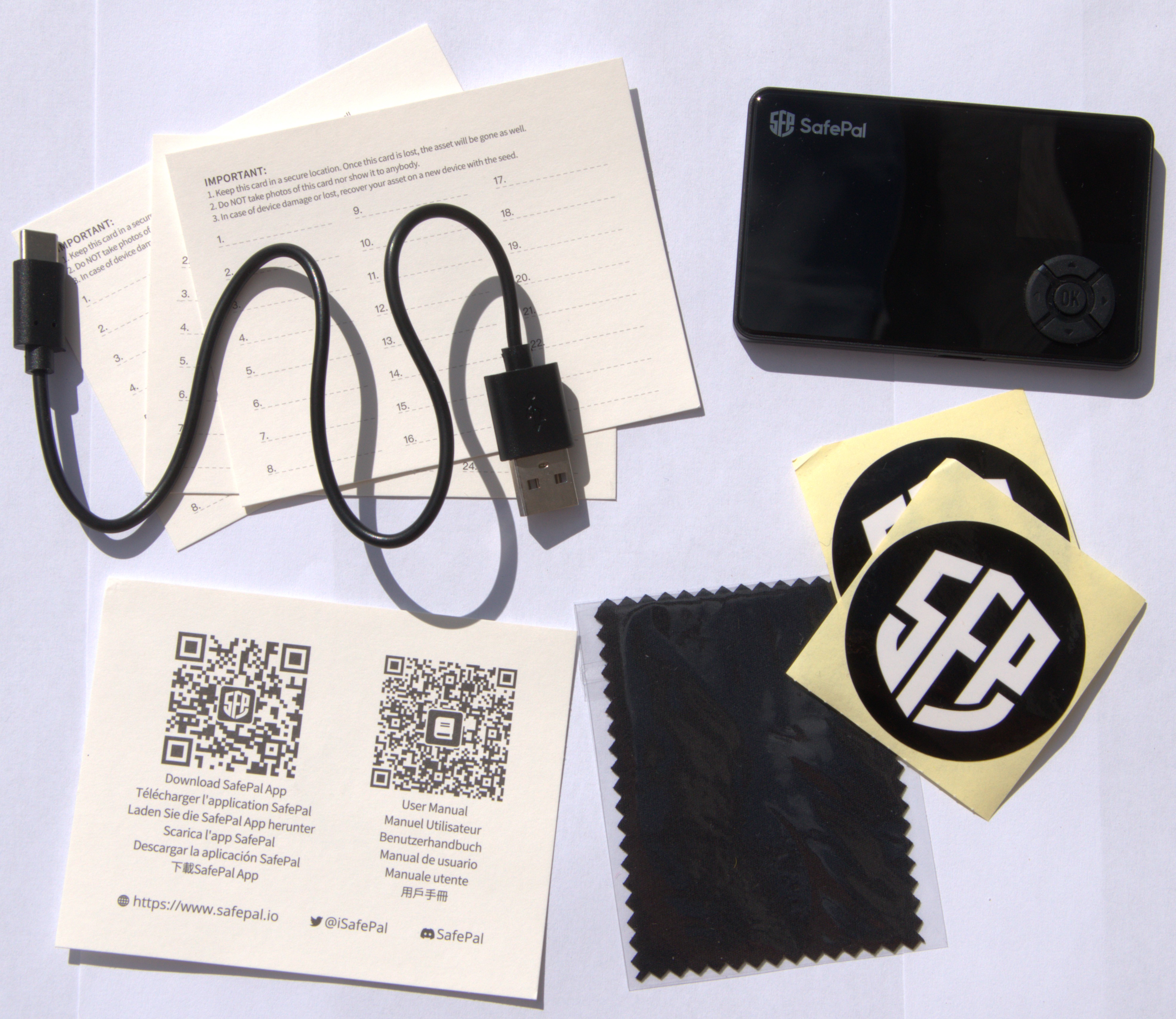 Zariadenie prichádza v malej čiernej krabičke, kde nájdeme SafePal S1, USB-C kábel, nálepky, jednoduchý návod a tiež papieriky na zapísanie seedu. Pre funkčnosť peňaženky budete potrebovať buď počítač, kde existuje do vybraných prehliadačov rozšírenie (napr. Chrome) alebo mobil. Aplikácia je dostupná ako pre Android tak pre iOS.