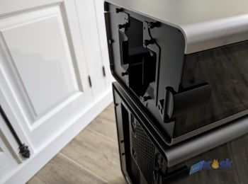 Vpravo vidno otvárací mechanizmus dvierok pre HDD. Rovnaký mechanizmus sa nachádza na spodnej strane dvierok. Každý časť skrinky, ktorá ide otvoriť má vždy dva kolíky.