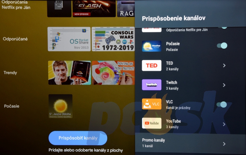 Domáce menu je rozdelené na sekcie – kde sú aplikácie a potom akési návrhy z jednotlivých aplikácií. Pre príklad, Netflix na základe toho čo sledujete odporúča nové filmy a seriály, ktoré by sa vám mohli páčiť. Youtube zase z vami odoberaných kanálov odporúča rôzne tematické videá.