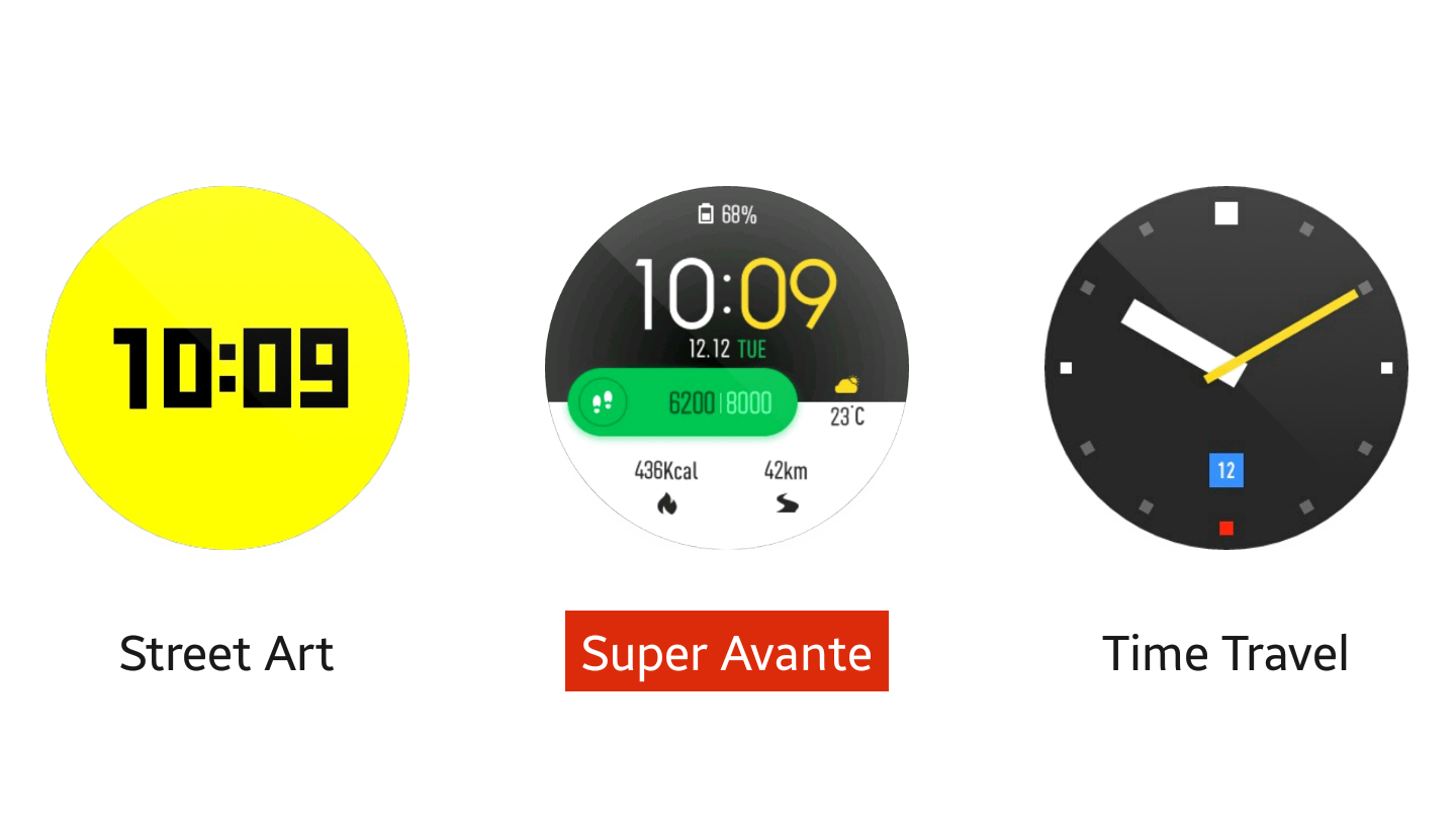 Na hodinkách si viete nastaviť ich vzhľad, v ponuke je 15 tvárí, na ktorých je čas zobrazený buď analógovo alebo digitálne, pričom v tom – ktorom type sú zobrazené základné meracie hodnoty, teda môže ukazovať nie len čas, ale i pomenovanie dňa, dátum, počet krokov, spálené kalórie, stav batérie, aktuálny alebo naposledy zmeraný tep. Tiež si viete v niektorých tvárach nahrať vlastný obrázok a mať len ten svoj jedinečný dizajn.