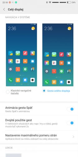 Ako som spomenul na začiatku, Redmi 5 Plus nemá hardvérové tlačidlá na ovládanie systému, ale softvérové. Okrem softvérových tlačidiel môžete systém ovládať gestami (tu sa Xiaomi inšpiroval u Iphone X). Ovládanie gestami je silne návykové. Po aktivovaní a odskúšaní tejto funkcie, som sa späť k softvérovým tlačidlám už nevrátil.