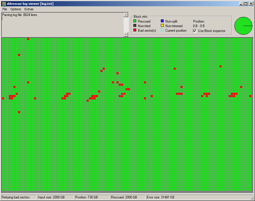(mapa vadných sektorov na poškodenom disku vizualizáciou logu z ddrescue programom ddrescueview)