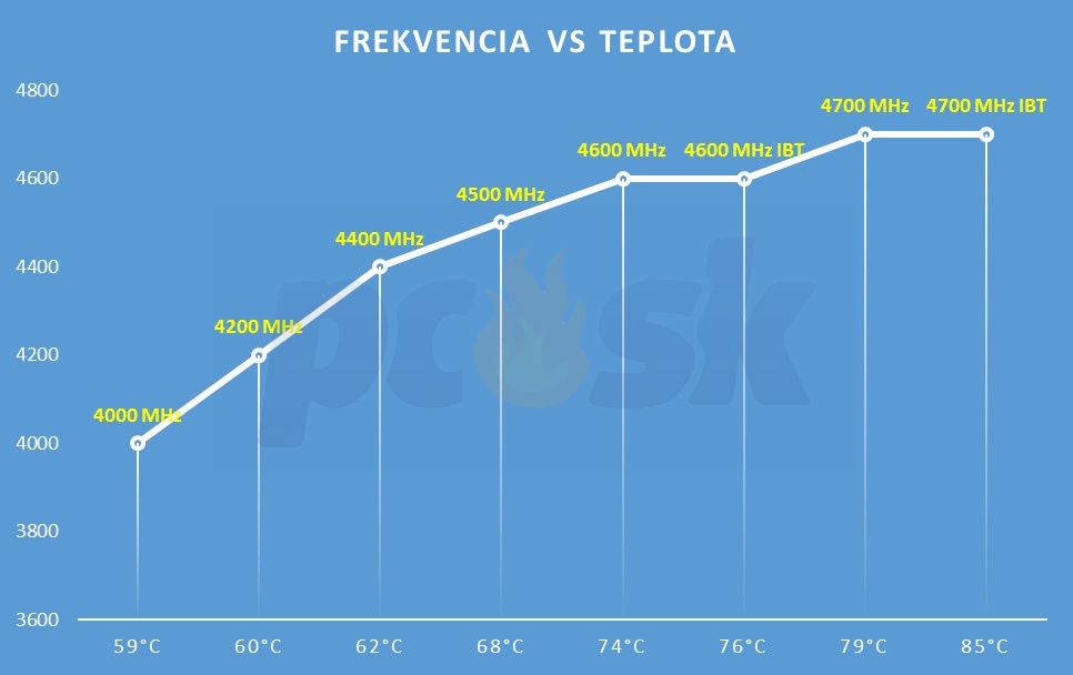 Na prvom grafe porovnávam nárast frekvencie a teploty. Otáčky a pumpu riadi doska. Nemením rýchlosť L3 cache, len samotných jadier. Na grafe je uvedená najvyššia zaznamenaná teplota niektorého z jadier. Rozdiel medzi jadrami môže byť aj pár stupňov. Nevyzerá to vôbec zle, 4700 MHz? OK ale napätie? To nám povedia ďalšie grafy...