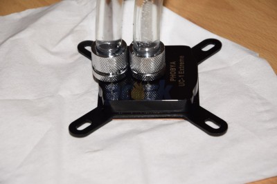 Keď už máme systém zapojený, napúšťame ho cez expanznú nádobu tekutinou (nutnosťou je destilovaná voda alebo zmes, v našom prípade som použil farebnú prímes Phobya s vodou od Aquatuning). Nezabudnite ale odpojiť všetky komponenty od zdroja (ak by náhodou tiekol systém aby nedajbože nedošlo k skratku, aj keď použitá destilovaná voda nie je vodivá; okrem toho by ste neustálymm vypínaním a zapínaním skracovali životnosť dosky), všetko čo budete robiť je spínať zdroj - buď pomocou jednoduchého konvertora (občas súčasťou zdroja) alebo jednoduchou spinkou - odporúčam pozrieť youtube.