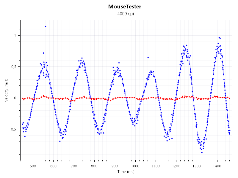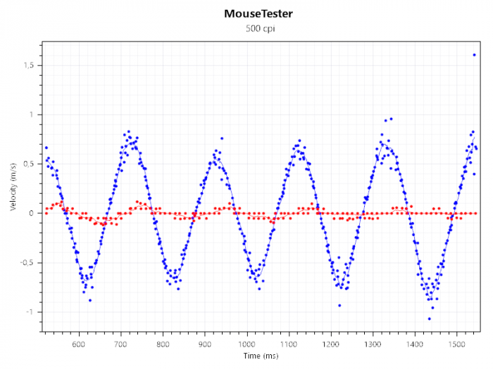 Velocity vs Time - program z nameraných dát (počet správ, časový interval medzi nimi a DPI) vypočítava rýchlosť, akou sme hýbali myšou. Počas testu sa s ňou snažíme pohybovať čo možno najrýchlejšie, čím sa dajú odhaliť dalšie problémy senzora, ktorý môže zlyhávať pri rýchlych/trhavých pohyboch myši. Opäť je dôležité zachovanie rovnomerného rozloženia bodiek okolo spriemerovanej trajektórie.