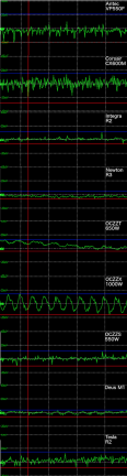 Pri +5V vetve možno taktiež konštatovať, že každý jeden testovaný kúsok splnil normu. V tomto prípade si najlepšie počínali modely od Fractalu. Jak Integra R2, Tesla R2 i Newton R3 vykázali veľmi nízke zvlnenie takmer do 20mV (model Integra R2 vykazoval mierne vyššie zvlnenie nad 20mV pri PSU teste). Mierne horšie, no stále veľmi dobre si počínali modely od OCZ. Jak ZS550W, ZT650W i ZX1000W vykázali zvlnenie v dolnej polovici tabuľky. Skvelé výsledky! Najhoršie výsledky dosiahol model od Corsair s označením CX600M. Opäť pripomínam, že namerané hodnoty sú stále v norme a či máte na +3,3V/+5V zvlnenie 10mV alebo 30mV je v praxi asi úplne jedno. Samozrejme, čím menšie, tým lepšie. Všimnime si stabilný výkon u nás menej známeho zdroja od Silentium PC s označením Deus M1