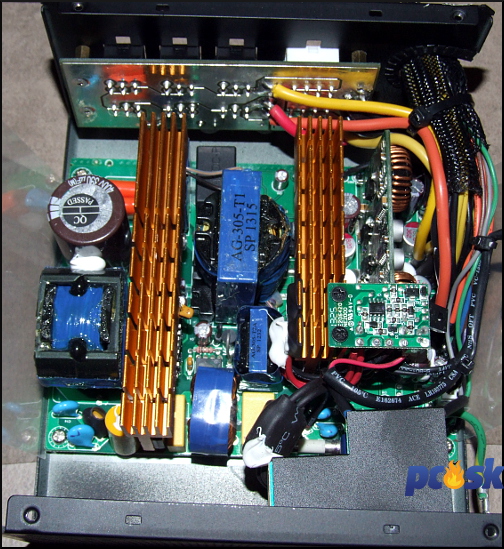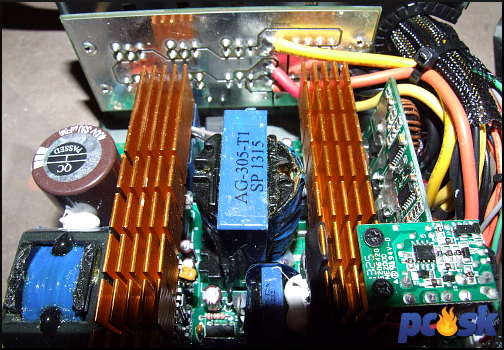 Všimnime si zaujímavú maličkú dosku, ktorá je pripevnená k veľkému chladiču výkonových prvkov sekundáru. Táto doska integruje regulačný prvok pre osadený ventilátor. Zaujímavé je jeho umiestnenie práve na najhorúcejšiu časť zdroja. Ak to použitému obvodu neprekáža, je to jedno, i tak, niečo podobné vidím určite prvýkrát. Jednosmerné meniče z primárneho napätia sekundáru nájdeme na samostatnej doske. Sú umiestnené taktiež pri chladiči výkonových prvkov sekundáru.